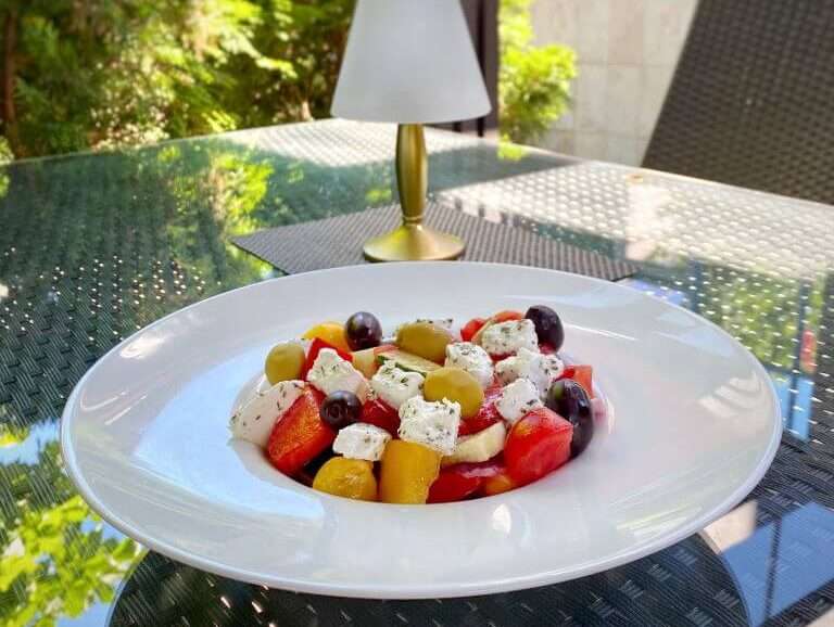 Rosii, castraveti, masline, ardei gras, branza feta, ceapa