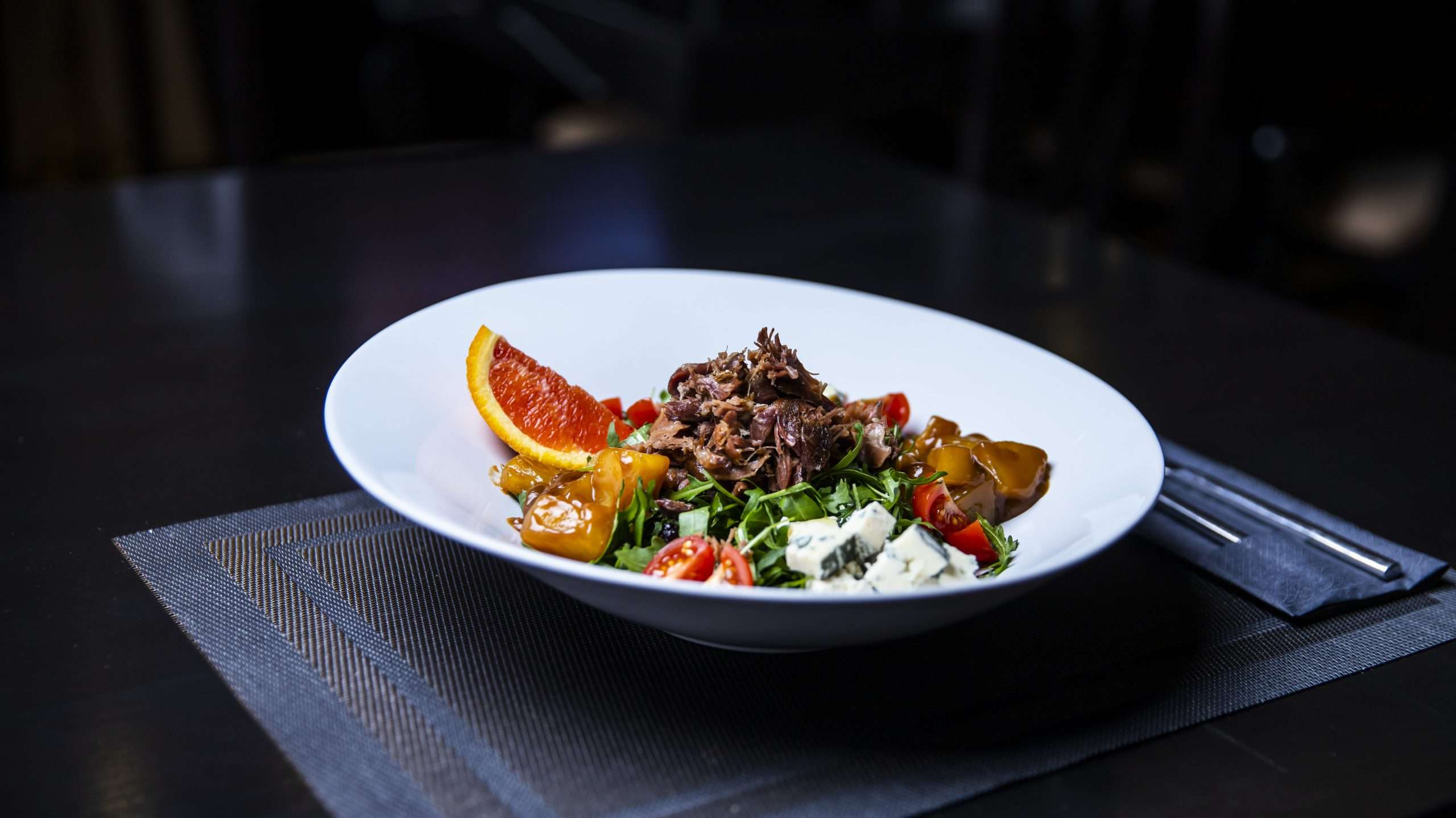 Rucola, rata, gorgonzola, ananas caramelizat, sos de fructe de padure